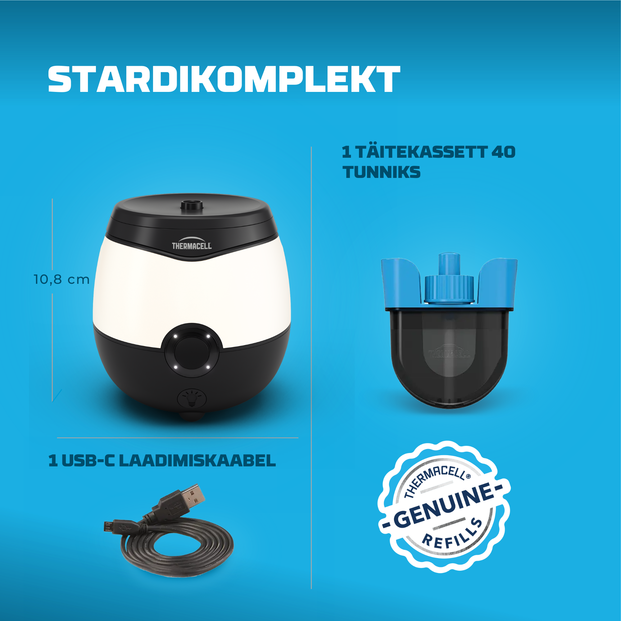- Tõrjub sääski kuni 40 tundi ühe täitekassetiga (täitepakendid ka eraldi saadval).